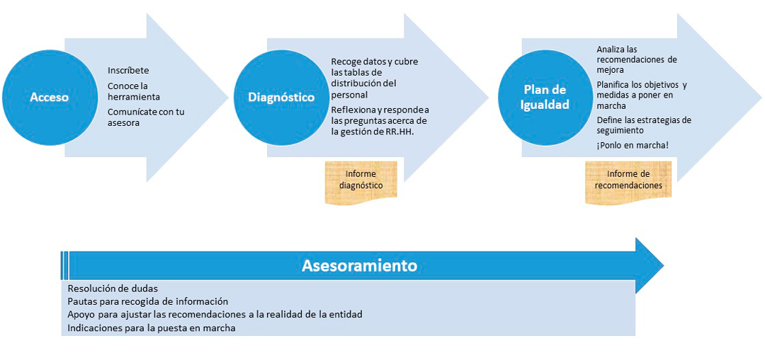 La utilización de la herramienta por parte de cada organización es un proceso que cuenta con el acompañamiento de un equipo asesor especializado de Fundación Mujeres, que conduce y orienta a la entidad a lo largo de todo el proceso.