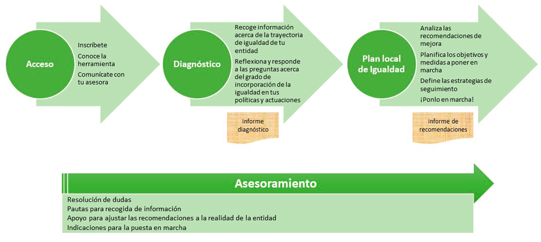La utilización de la herramienta por parte de cada organización es un proceso que cuenta con el acompañamiento de un equipo asesor especializado de Fundación Mujeres, que conduce y orienta a la entidad a lo largo de todo el proceso.
